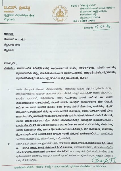 ಮೈಸೂರು, ಜನವರಿ 16, 2026: ಬಿಜೆಪಿ ರಾಷ್ಟ್ರೀಯ ನಾಯಕರ ವಿರುದ್ಧ ಆಧಾರರಹಿತ ಸುಳ್ಳು ಆರೋಪಗಳನ್ನು ಮಾಡಿರುವ ರಾಜ್ಯ ಕಾಂಗ್ರೆಸ್ ವಕ್ತಾರ ಎಂ. ಲಕ್ಷ್ಮಣ್ ಅವರ ವಿರುದ್ಧ ಕಾನೂನು ಕ್ರಮ ಕೈಗೊಳ್ಳುವಂತೆ ಆಗ್ರಹಿಸಿ ಬಿಜೆಪಿ ನಿಯೋಗವು ಮೈಸೂರು ನಗರ ಪೊಲೀಸ್ ಆಯುಕ್ತೆ ಸೀಮಾ ಲಾಟ್ಕರ್ ಅವರಿಗೆ ದೂರು ಸಲ್ಲಿಸಿದೆ.