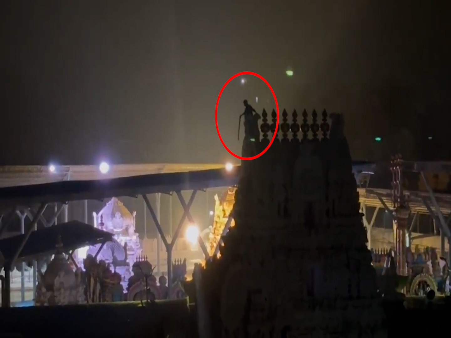 ರುಪತಿಯ ಗೋವಿಂದರಾಜ ಸ್ವಾಮಿ ದೇವಸ್ಥಾನದಲ್ಲಿ ಶುಕ್ರವಾರ ರಾತ್ರಿ ಈ ಘಟನೆ ಸಂಭವಿಸಿದೆ. ದೇಗುಲದಲ್ಲಿ ‘ಏಕಾಂತ ಸೇವೆ’ ಮುಗಿದ ಸಂದರ್ಭದಲ್ಲಿ ಆಗಂತುಕ ಭದ್ರತಾ ಪಡೆಗಳ ಕಣ್ತಪ್ಪಿಸಿ ಕಂಪೌಂಡ್ ಹಾರಿ ಒಳಬಂದು ಏಕಾಏಕಿ ಗೀಪುರ ಏರಿದ್ದಾನೆ. ನಂತರ ಅಲ್ಲಿದ ಕಳಶಗಳನ್ನು ಎಳೆಯಲು ಯತ್ನಿಸಿದ್ದಾನೆ. ಇದು ದೇಗುಲದ ಸಿಬ್ಬಂದಿ ಮತ್ತು ಭಕ್ತರಲ್ಲಿ ಭಯ ಹುಟ್ಟಿಸಿತು. ನಂತರ ಆರೋಪಿಯನ್ನು ಭದ್ರತಾ ಸಿಬ್ಬಂದಿ ವಶಕ್ಕೆ ಪಡೆದರು.