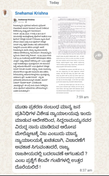 ದೂರುದಾರ ಸ್ನೇಹಮಯಿ ಕೃಷ್ಣ ಅವರು ತಮ್ಮ ಸಾಮಾಜಿಕ ಜಾಲತಾಣದ ಖಾತೆಯಲ್ಲಿ ರಾಜ್ಯ ಸರ್ಕಾರದ ಭವಿಷ್ಯದ ಬಗ್ಗೆ ಮಹತ್ವದ ಪ್ರಶ್ನೆಯೊಂದನ್ನು ಎತ್ತಿದ್ದಾರೆ.  “ಮುಖ್ಯಮಂತ್ರಿ ಸಿದ್ದರಾಮಯ್ಯ ವಿರುದ್ಧ ನಾನು ಮಾಡಿರುವ ಆರೋಪಗಳು ಮೇಲ್ನೋಟಕ್ಕೆ ನಿಜ ಎಂಬುದು ಮಾನ್ಯ ನ್ಯಾಯಾಲಯಕ್ಕೆ ಖಚಿತವಾಗಿ, ಹೆಚ್ಚಿನ ವಿಚಾರಣೆಗೆ ಅವಕಾಶ ಸಿಗುವಂತಾದರೆ… ರಾಜ್ಯ ರಾಜಕೀಯದಲ್ಲಿ ದೊಡ್ಡ ಬದಲಾವಣೆ ಆಗಬಹುದೇ?” ಎಂದು ಸ್ನೇಹಮಯಿ ಕೃಷ್ಣ ತಮ್ಮ ಸಾಮಾಜಿಕ ಜಾಲತಾಣದಲ್ಲಿ ಪೋಸ್ಟ್‌ ಮಾಡಿದ್ದಾರೆ.